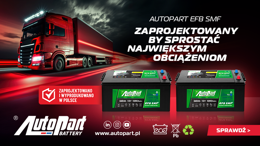 NOWOŚĆ: Akumulator AUTOPART EFB SMF (Enhanced Flooded Battery – Sealted Maintance Free) stworzony z myślą o pojazdach dalekobieżnych, z funkcjami hotelowymi, a także spełniających normę Euro5 i Euro6, w których akumulatory montowane są na tylnej osi pojazdu. Akumulator wyróżnia się najmocniejszymi parametrami z oferty dostępnej dla samochodów ciężarowych: pojemność 240Ah i prąd rozruchu 1250A.